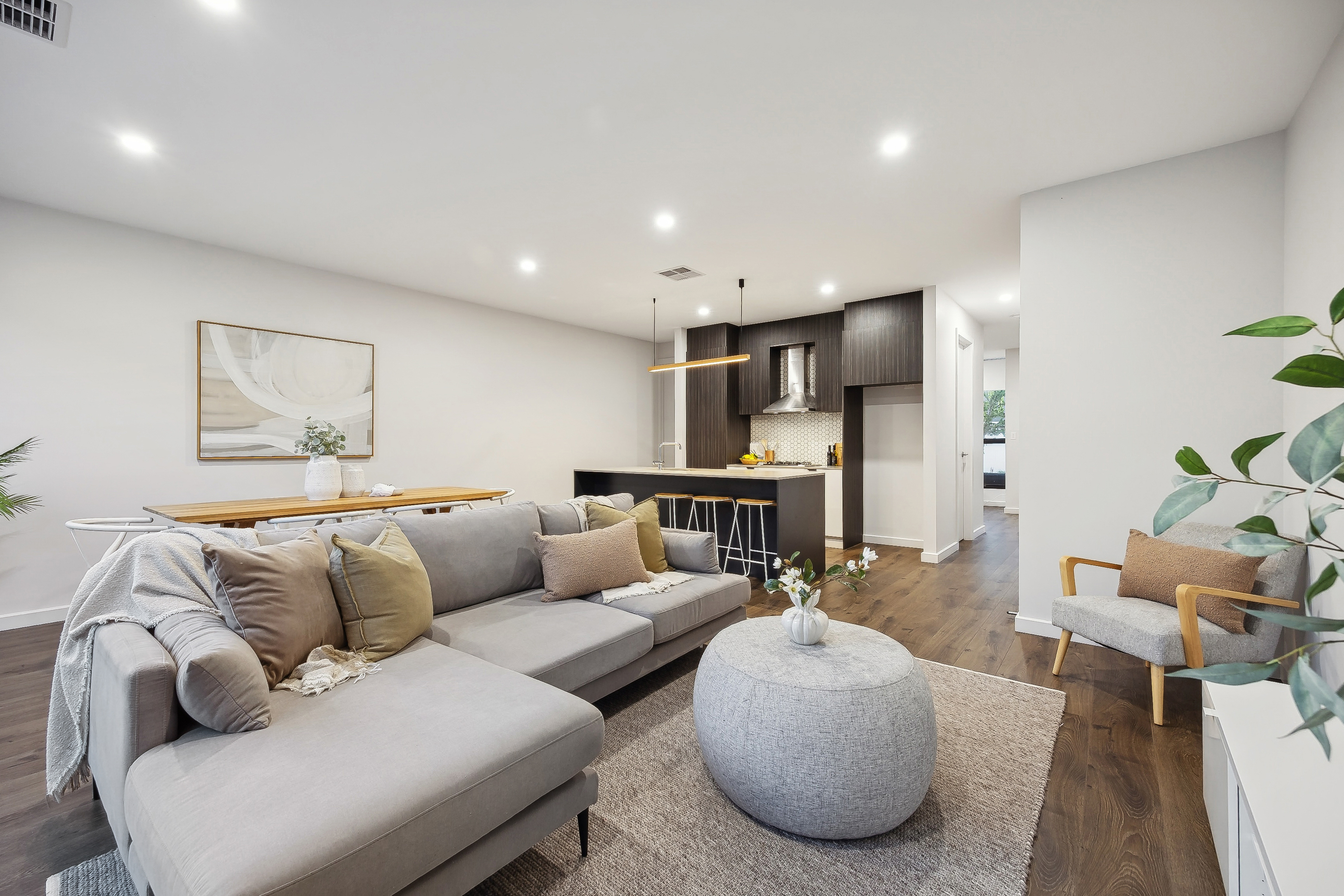 From its timber front door and sunny first lounge to the natural flow of the open plan living to the great outdoors and a fully-equipped chef's kitchen, it's easy to imagine settling into a comfortable routine here; whether it's family dinners with the sliding doors open, cosy weekends curled up watching movies, Friday night drinks around the island bar, or Sundays under the sun on the patio.